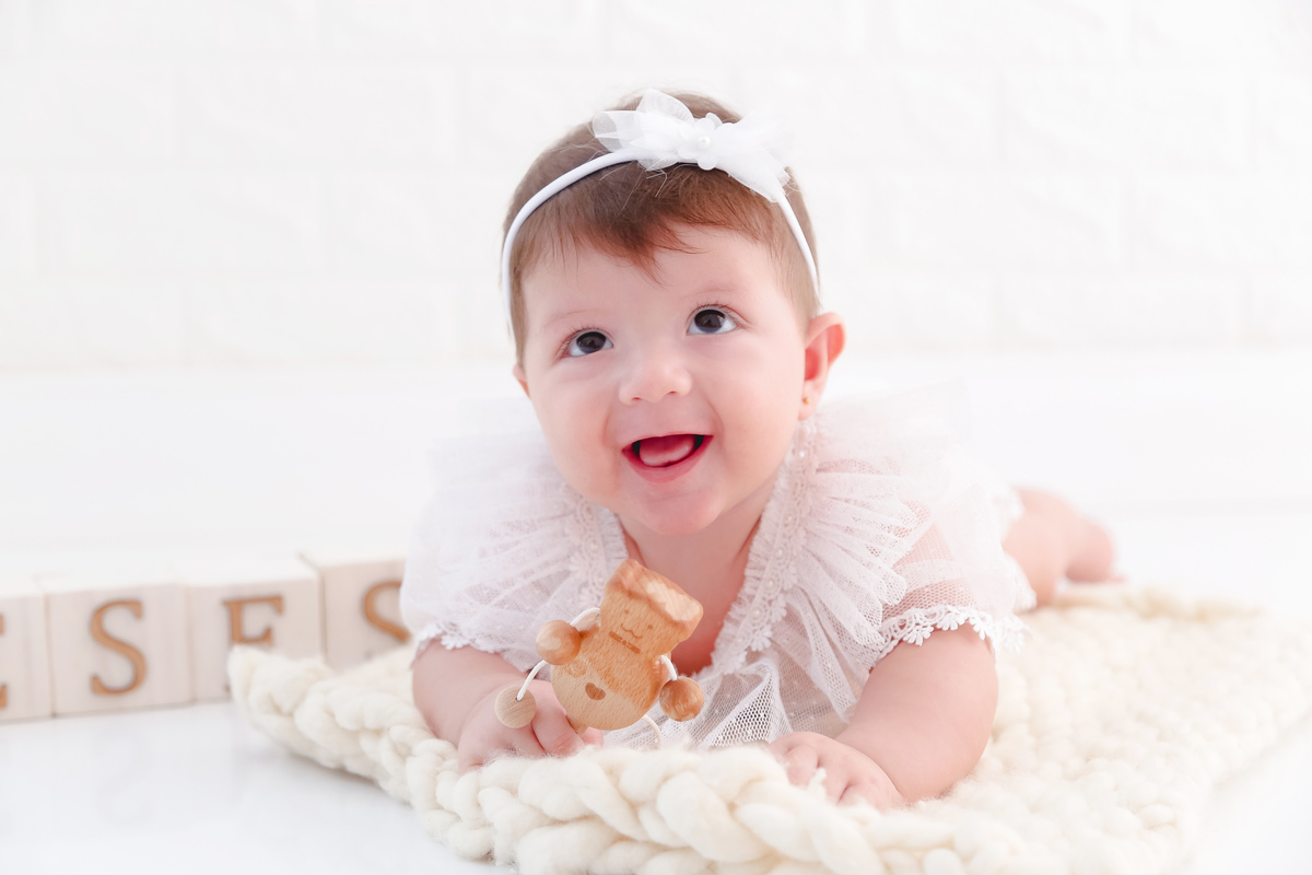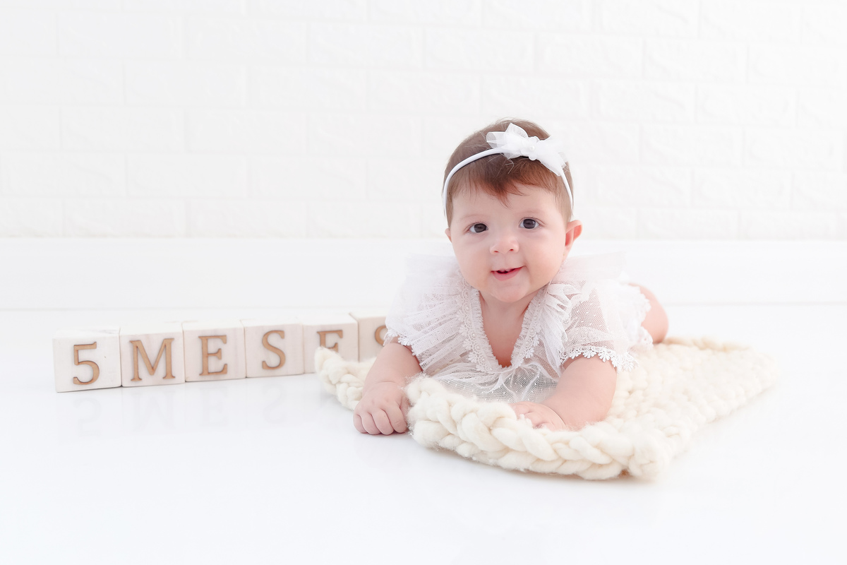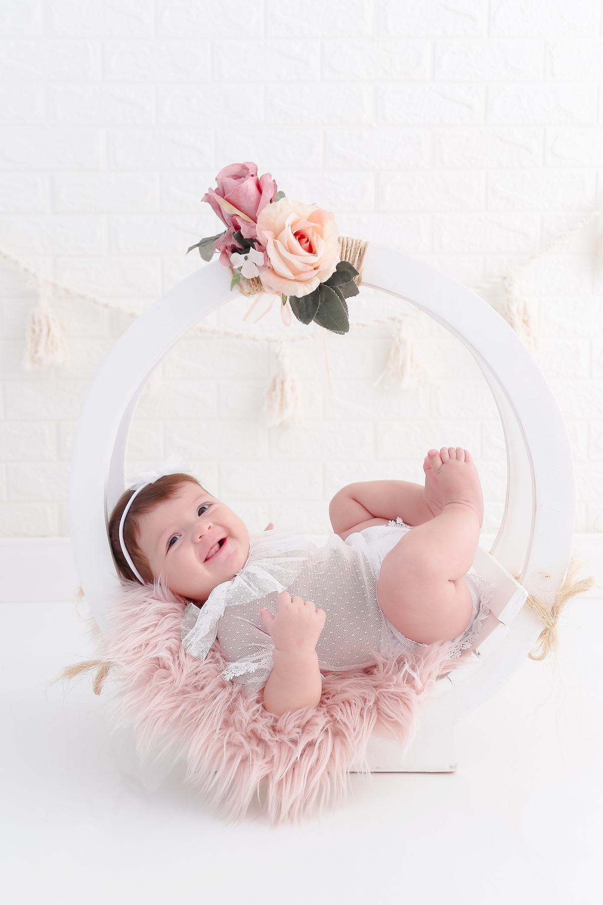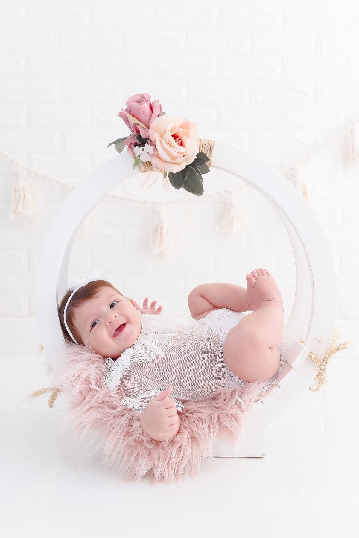 No ensaio de 4 meses gosto de ousar colocando o bebê nesse props, que é um arco curvo, que deixa a posição muito linda. Trabalho nele duas posições: bebê de barriga para cima e de bruços. De bruços ou tummy time, os bebês amam ficar. Dão muitas risadas gostosas para foto. É ai que vamos captando tudo.