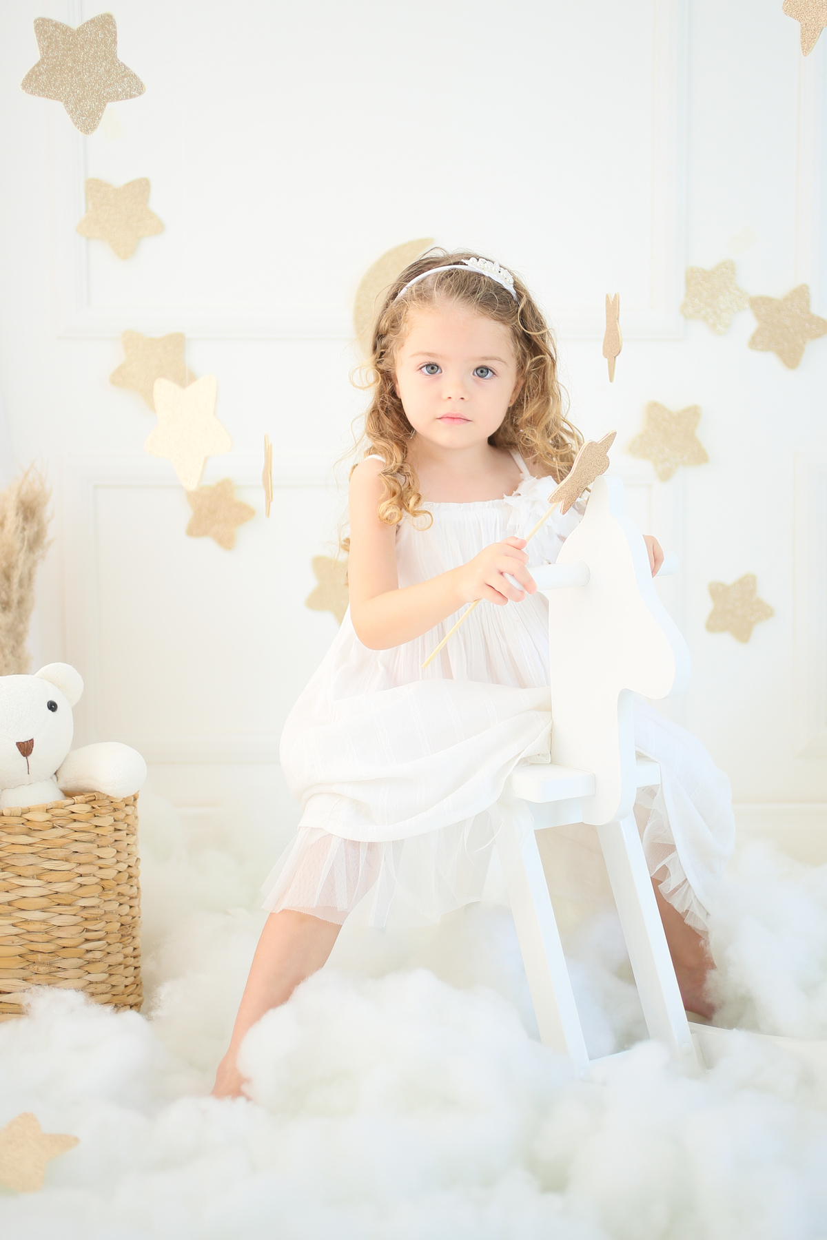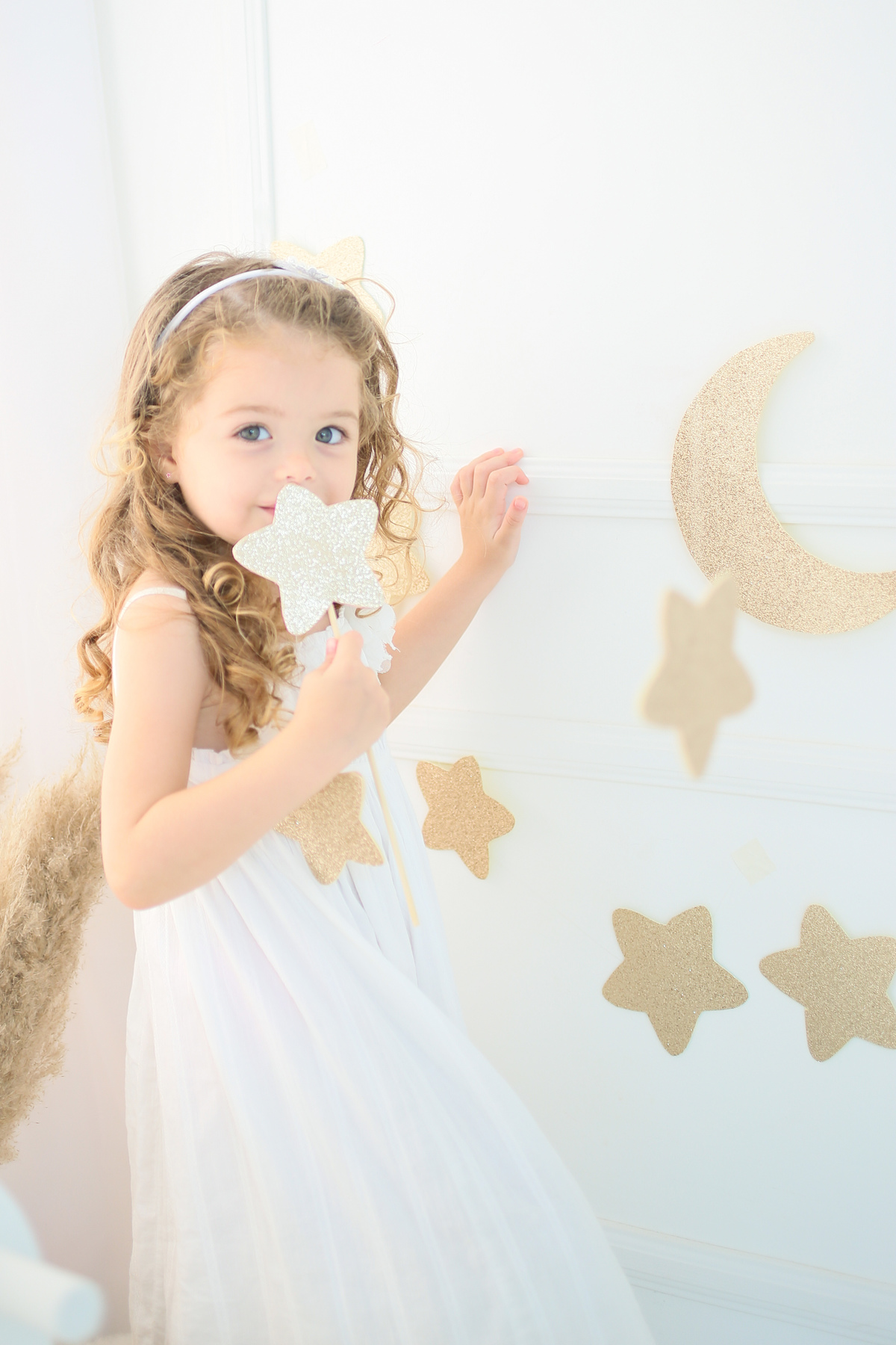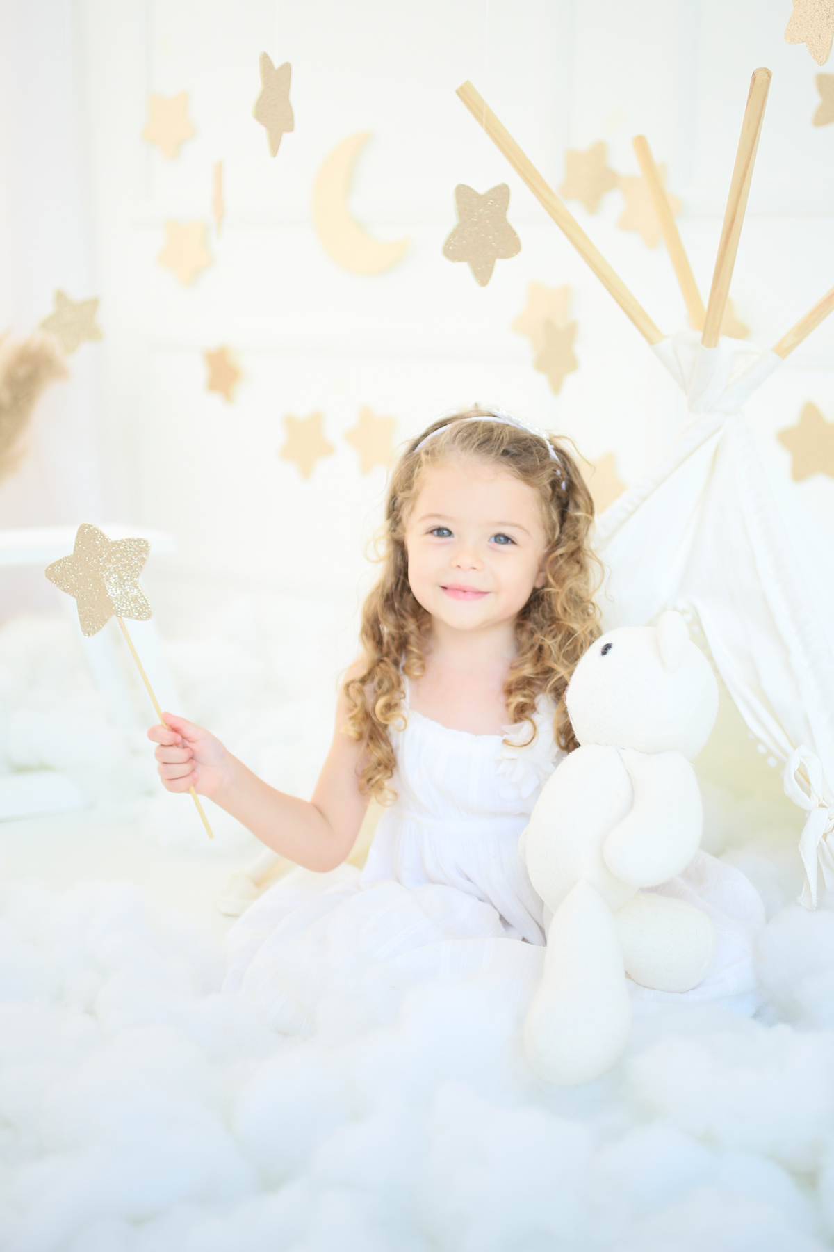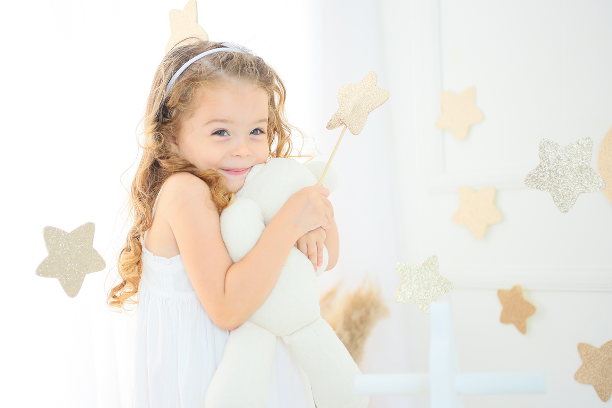 estrelinhas menina doce fofura delicadeza ensaio de criança dourado brilho ursinho urso de pelucia capim dos pampas cachinhos cavalo de madeira minimalismo boho ensaio boho ensaio minimalista lua abraço
