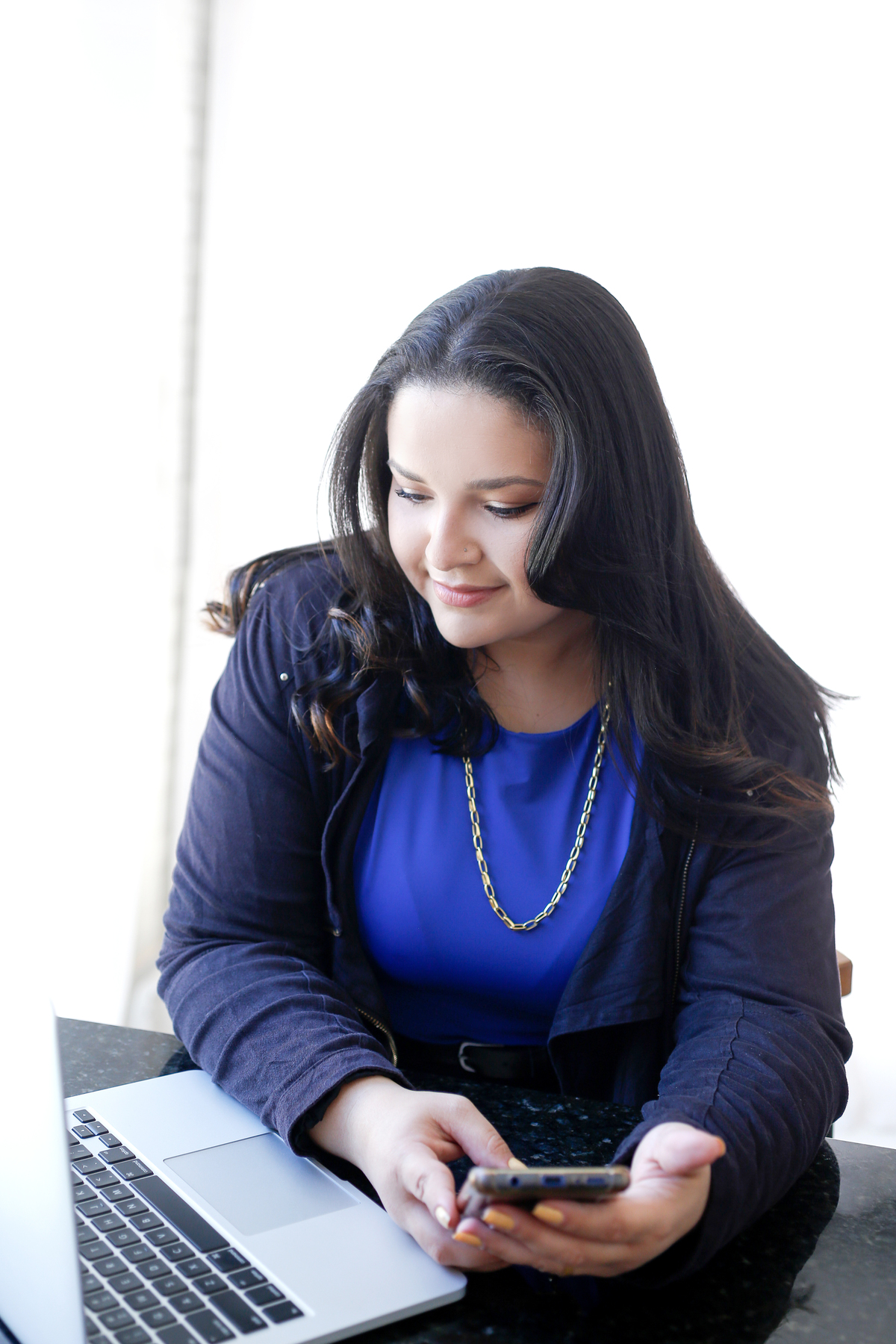A Mariana Ruiz é especialista em midias sociais. Ela precisava de fotos com as principais ferramentas de trabalho dela: o celular e o computador. Foi assim que realizei imagens abordando esse tema, bem como alguns retratos variados para compor as redes sociais dela, de forma que ela pudesse colocar texto com gatilhos por cima das imagens feitas aqui no estúdio.