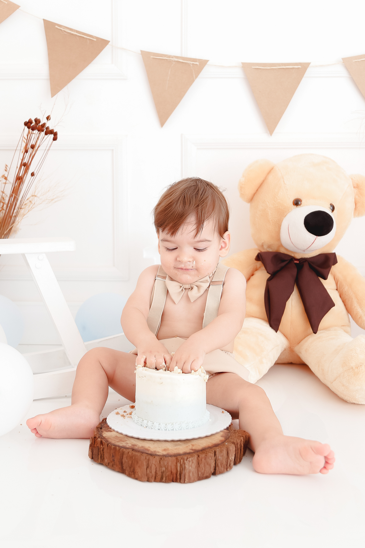 O smash the cake é sempre um ensaio feito para comemorar o primeiro ano de vida do bebê. Aqui no estúdio uso o estilo minimalista aliado com o boho chic associados a cores que proporcionam a sessação de paz e harmonia, ressaltando sempre o assunto principal: o bebê. pai e mãe também se divertem nesse ensaio. Confira como foi o ensaio do Bernardo, que fez todo o acompanhamento mensal aqui no estúdio.