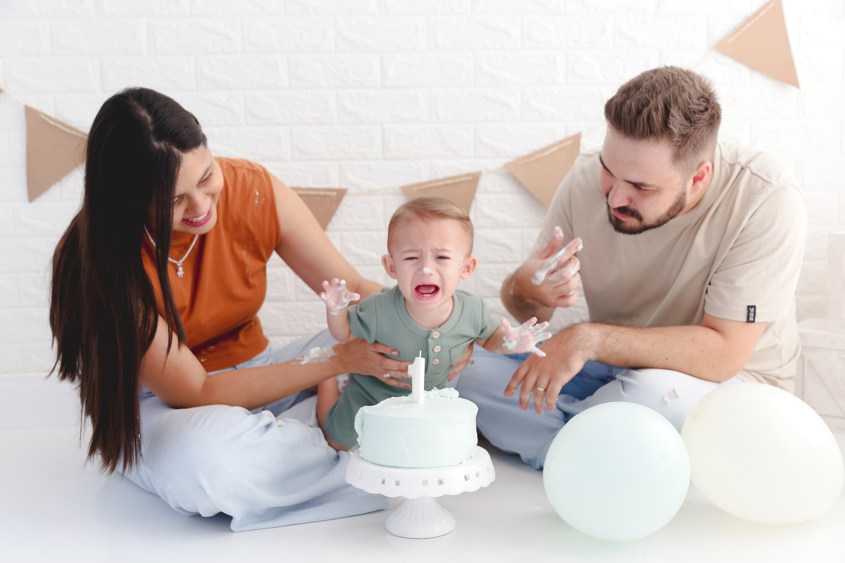 O smash the cake é um momento muito esperado pelos papais ávidos aos ensaios de acompanhamento do bebê. Uns riem, amam, se sujam com o bolo, já outros ficam com nojo, choram, ou ficam com medo do bolo. Qualquer que seja a reação do bebê, o importante é registrar, porque é isso que vai contar a história no futuro para ele. O meu filho mesmo odiou a ideia, como o Noah, no ensaio dele. Quando o bolo chegou, ele começou a chora de medo, ou nojo (a gente não sabe bem o que foi). Mas a mamãe dele não desanimou e mesmo assim continuou firme no ensaio para garantir as fotos que ela tanto queria guardar de lembrança. No fim, esse chorinho dele ficou um charme!