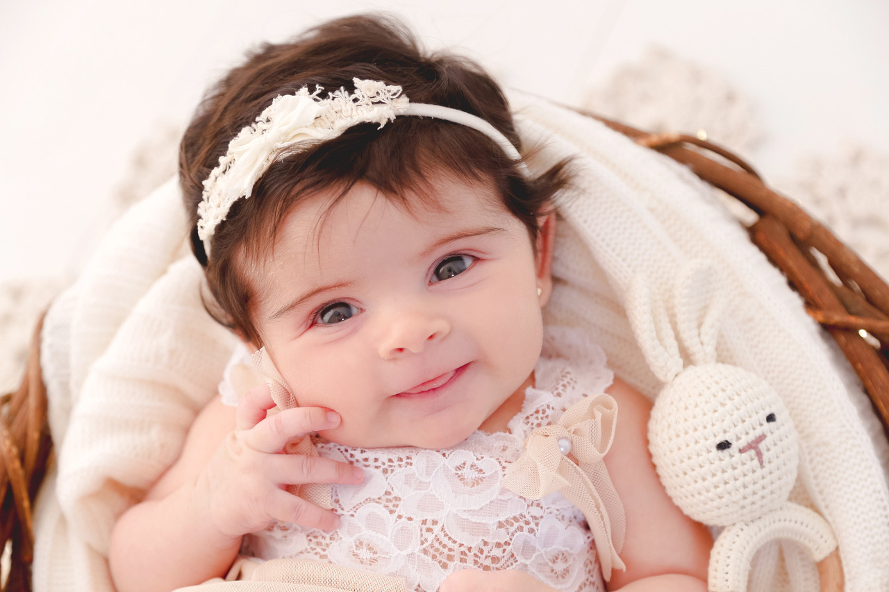 Por volta do segundo mês de vida do bebê, o sorriso, que antes era apenas um reflexo sem intenção, começa a a ser social (intencional). Portanto é sempre possível conseguir captar algumas risadinhas nessa fase.