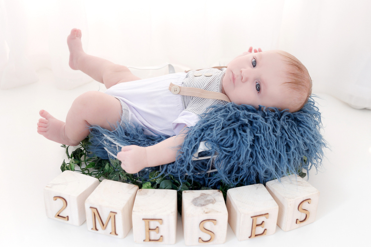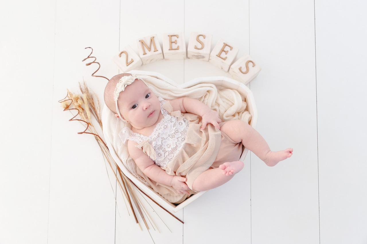Aos dois meses de vida, a criança continua ainda bem "molinha", não sustentando devidamente o corpo e o pescoço. Por isso, o fotógrafo precisa ser criativo para explorar as poses do bebê deitado de barriga para cima, pois é assim que eles mais gostam de ficar nessa fase.